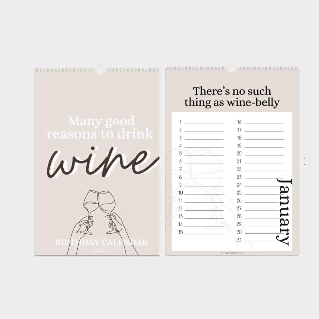 Deze verjaardagskalender in A4 formaat is ideaal om geen verjaardag meer te missen. Naast dat het erg handig is, is de kalender een super toffe toevoeging aan je interieur. Ook leuk als cadeau voor de echte wijn liefhebbers! Op elke maand staat een leuke tekst in het engels waarom je wijn zou mogen drinken!